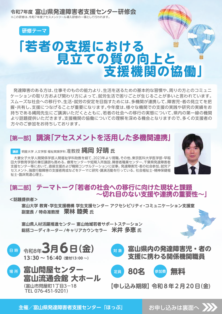 今年度は、様々な機関での支援の実践や研究の実績をお持ちである縄岡先生にご講演いただくとともに、若者の社会への移行の実態について、県内の第一線の機関より話題提供いただきます。発達障害のある方のスムーズな社会への移行や、生活・就労の安定を目指すためには、多機関が連携して、障害児・者の見立てを把握・共有し、支援につなげることが重要になります。支援機関の協働についての理解を深める機会となりますので、多くの支援者の方々のご参加をお待ちしています。